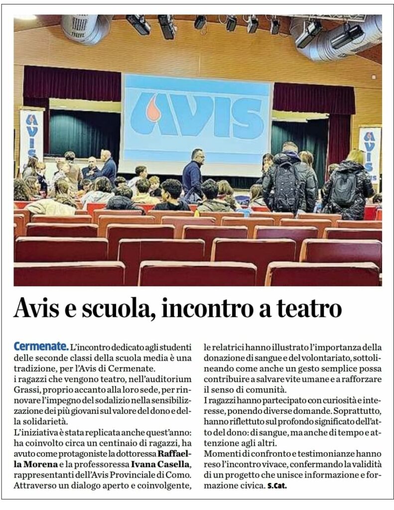 All’auditorium Grassi si è rinnovata una bella tradizione: l’incontro tra l’Avis di Cermenate e gli studenti delle seconde medie.